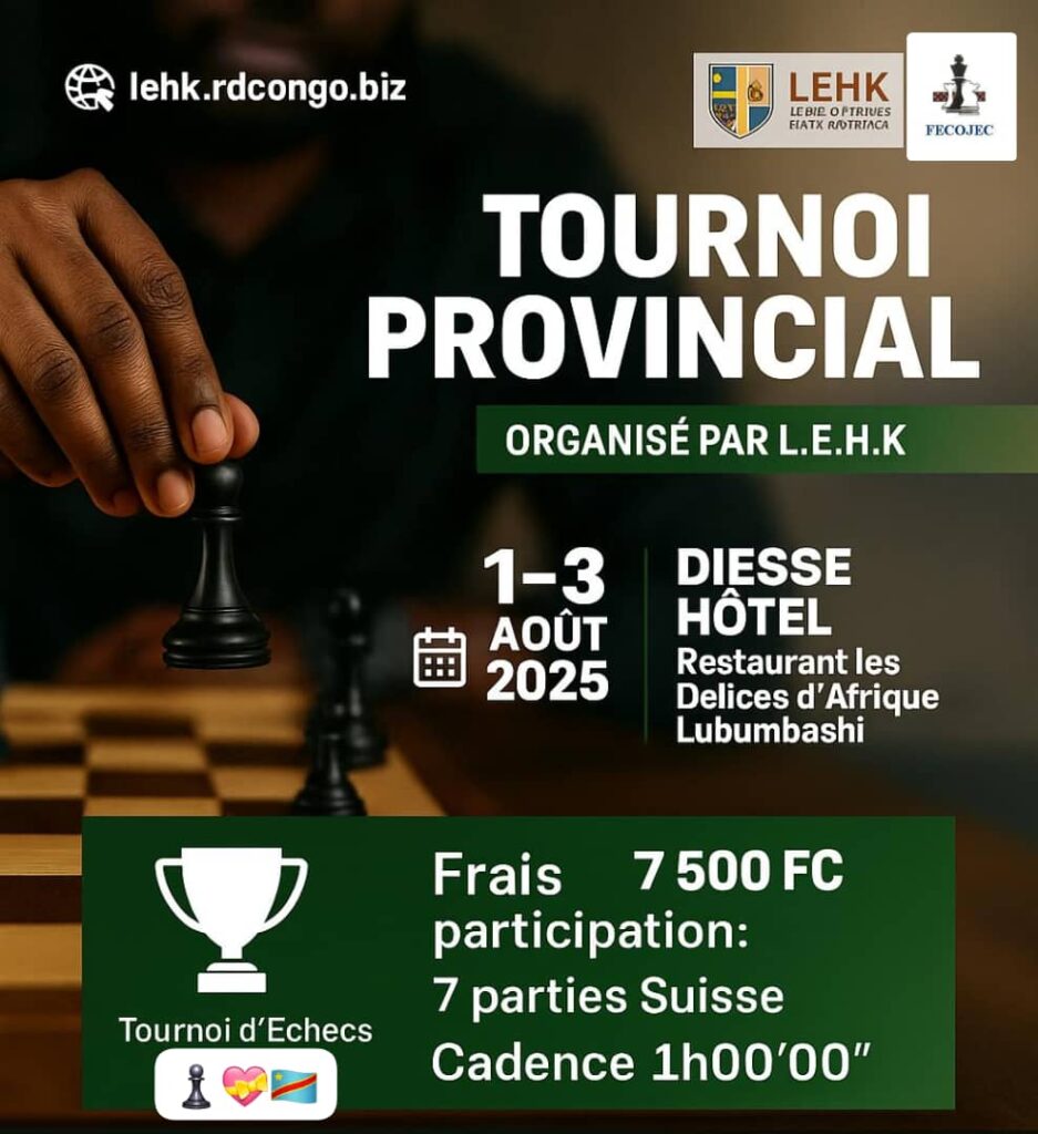 Du 1er au 3 août 2025, tous les regards seront tournés vers Lubumbashi, au Diesse Hôtel, pour un événement d’envergure organisé par la Ligue d’Échecs du Haut-Katanga (LEHK).